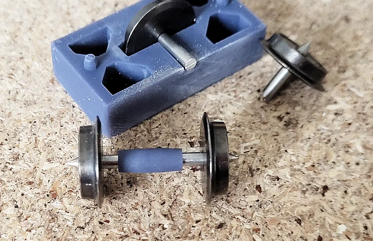 For current pickup I wanted to experiment with ways to increase number of contact points to a maximum, i.e. make each wheel (not wheelset) a pickup. For this, I used "AC" wheelsets, where "AC" means "for 3 rail Marklin system". In these wheelsets both wheel are electrically connected to the axle (compaed to DC wheelsets where one wheel is isolated from it). I cut the axle in half, 3D printed a joiner and connected the halves, so that pickup can happen on axle from both sides of the joiner. The pickups themselves are makde from phosphor copper bronze wire of 0.4mm. (I want to try phosphor bronze sheet later).