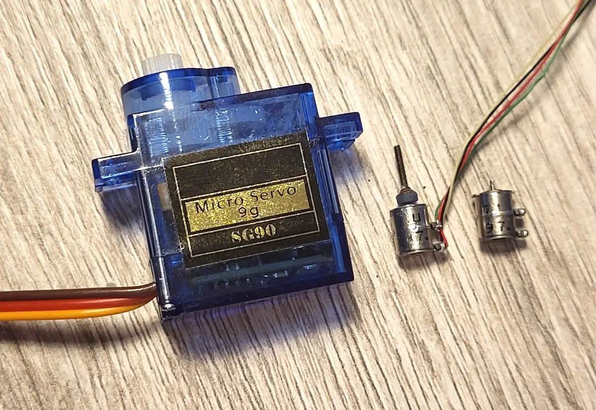 Bare stepper motor. Pros: tiny and give full control over kinematics. Cons: attaching anything to a tiny shaft is difficult.