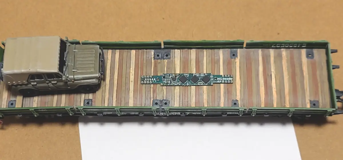 I couldn’t find any decoders with stepper control ability, so I decided to develop my own (honestly, I haven’t looked, but I’ve never heard of any). For added challenge, it had to fit into wagon’s frame, which is 6mm wide.